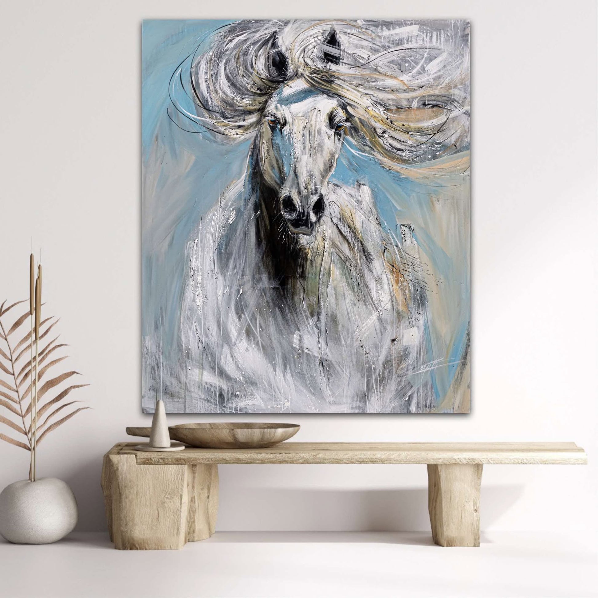 Liberté angélique, impression d'art moderne de l'artiste Confetti, coloré, cheval blanc, abstrait