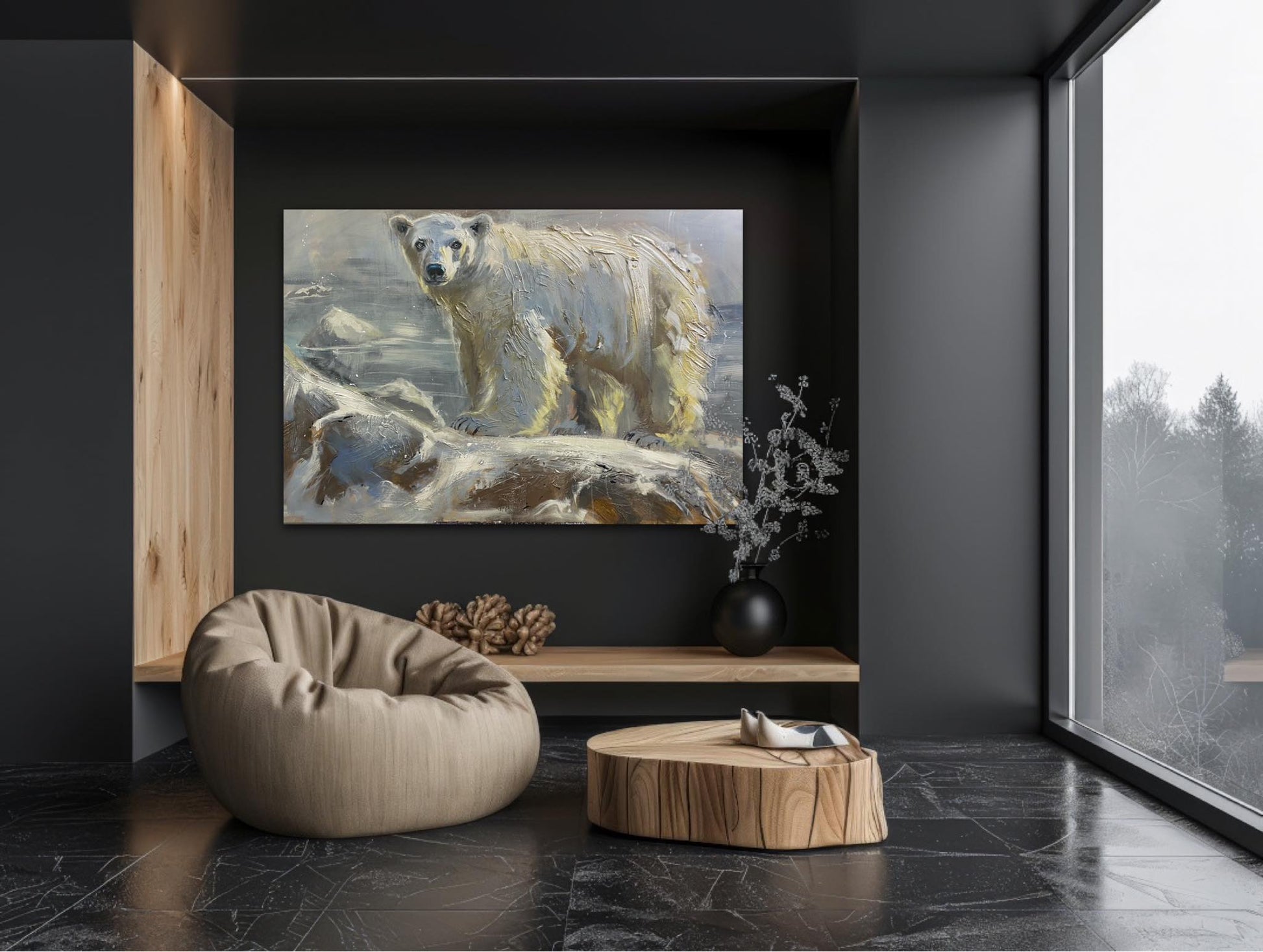Un regard intense, une présence qui domine l’espace… Cet ours polaire incarne la force et la résilience, au cœur de son royaume glacé. Une œuvre texturée et vibrante, qui impose sa présence.