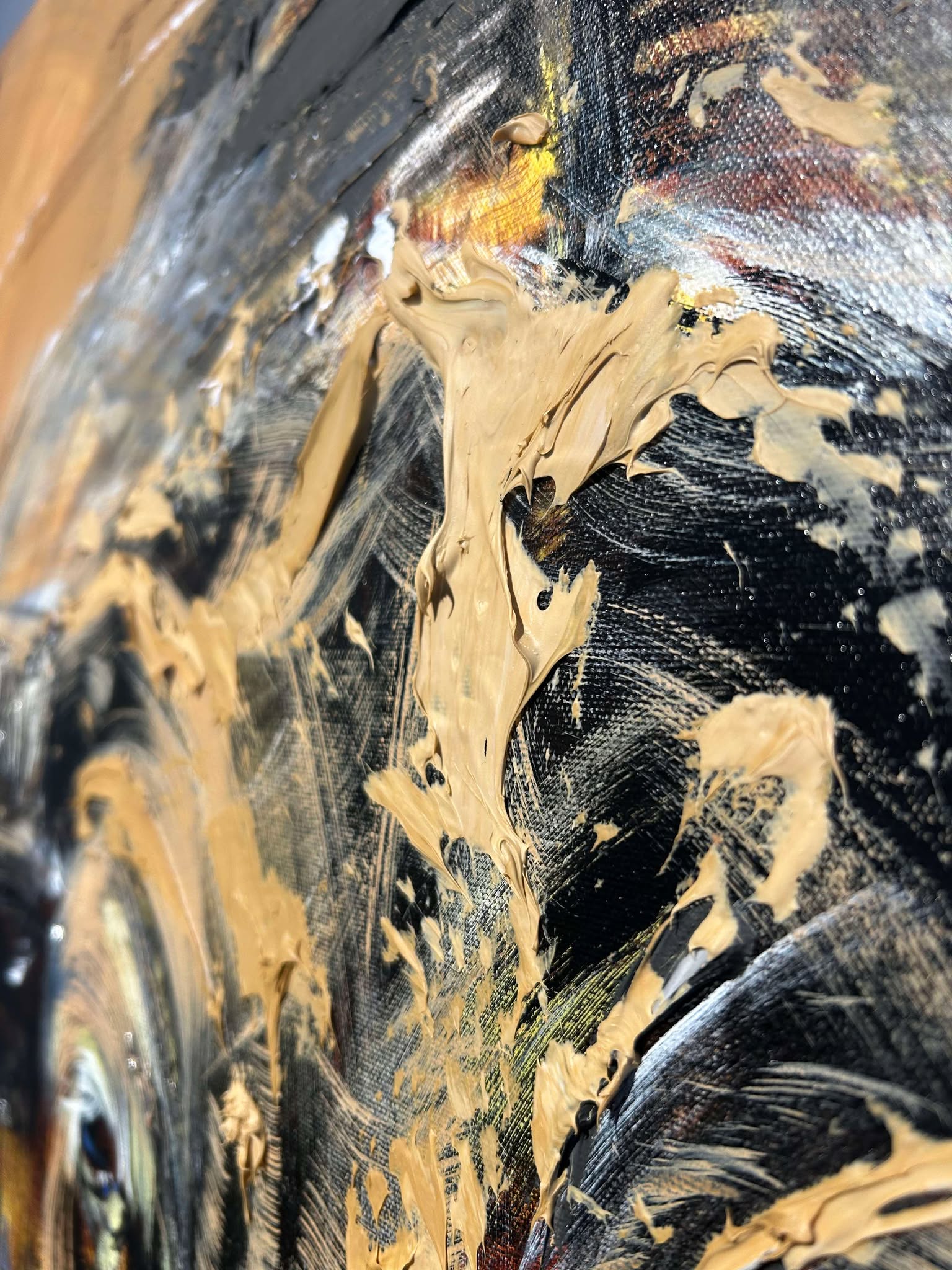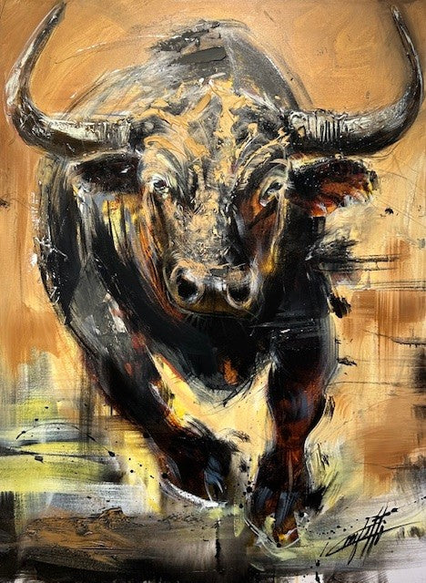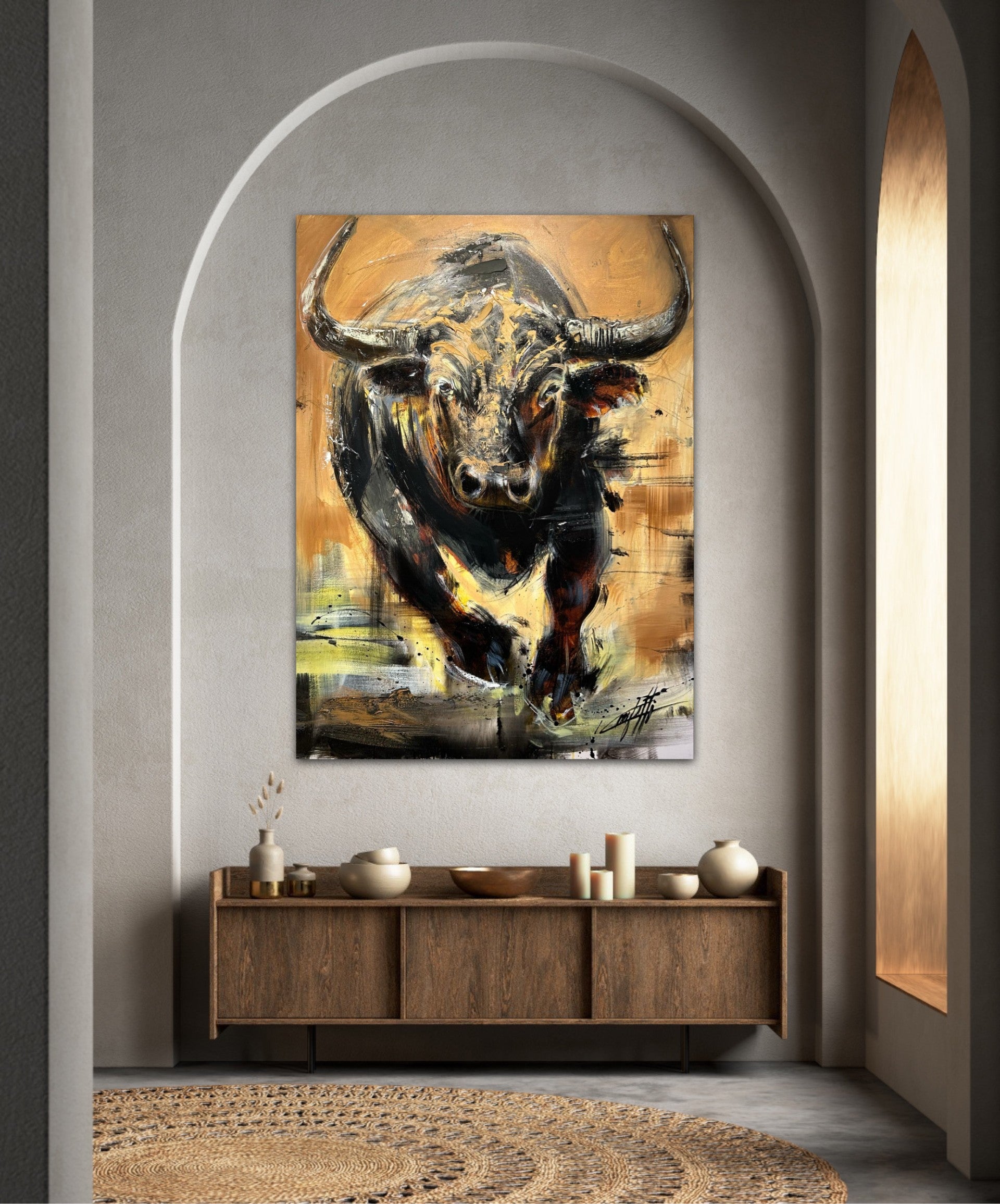 Esprit indomptable, le taureau, la peinture originale et moderne avec une grande texture par l’artiste Confetti, animal, couleur chaude