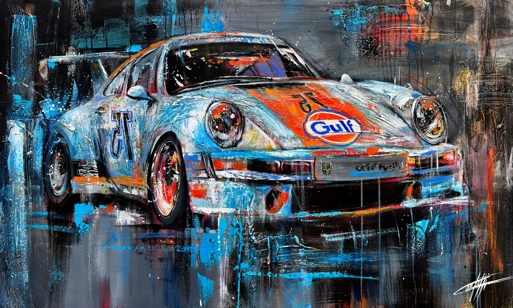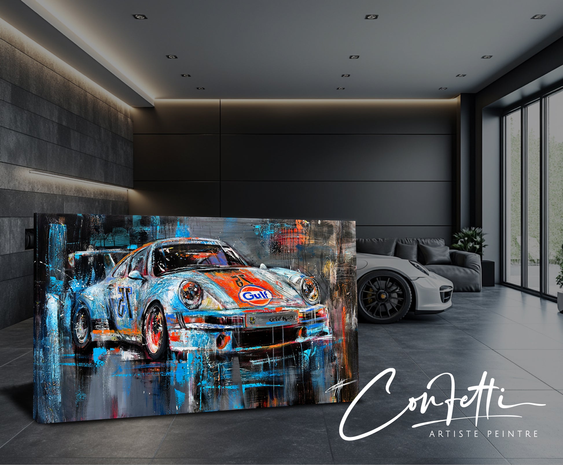 Porsche pulse gt, gt3 art print par l'artiste Confetti avec beaucoup de texture, voiture de course, Porsche 911 colorée