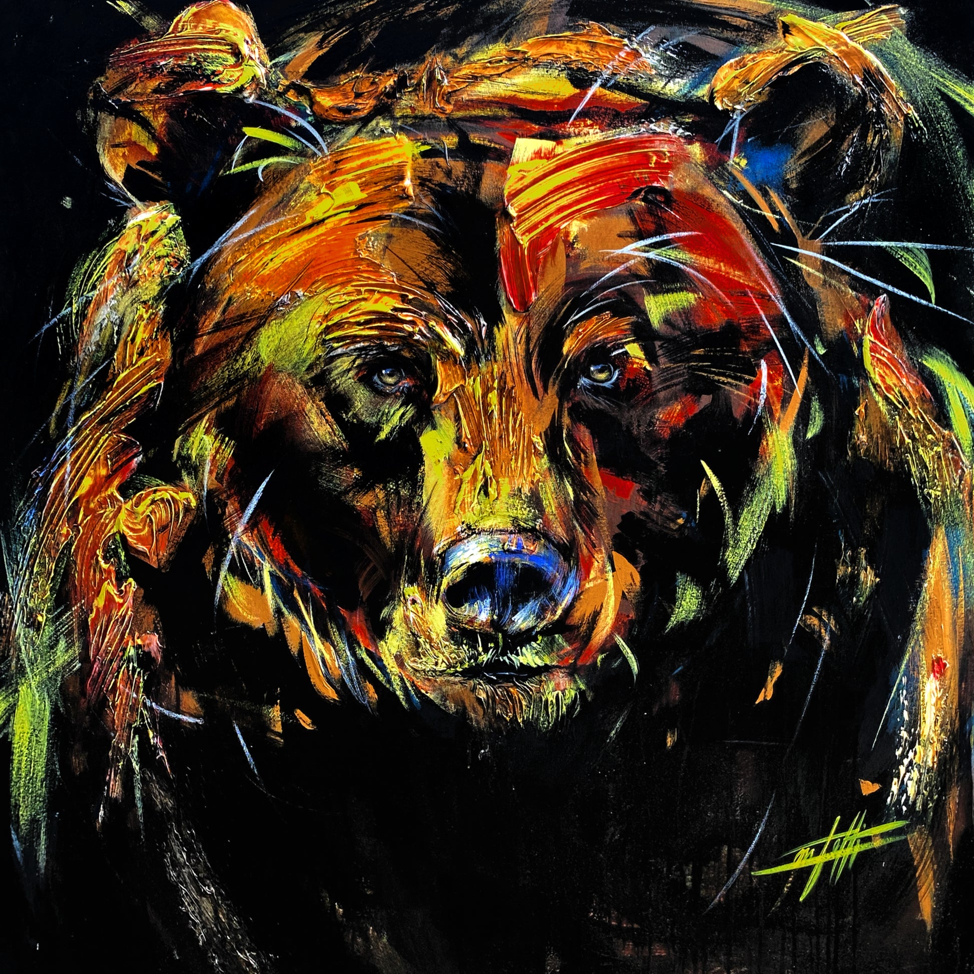 Bernard l’ours d’or, impression d’art moderne par l'artiste Confetti, texturé, coloré, ours, abstrait