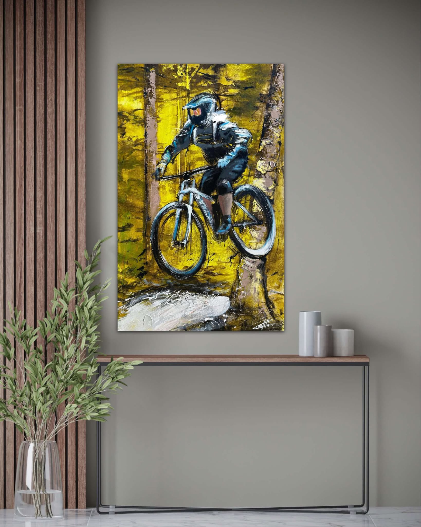 Liberté sur deux roues, impression d'art de Confetti, vélo de montagnes avec beaucoup de texture, nature, coloré