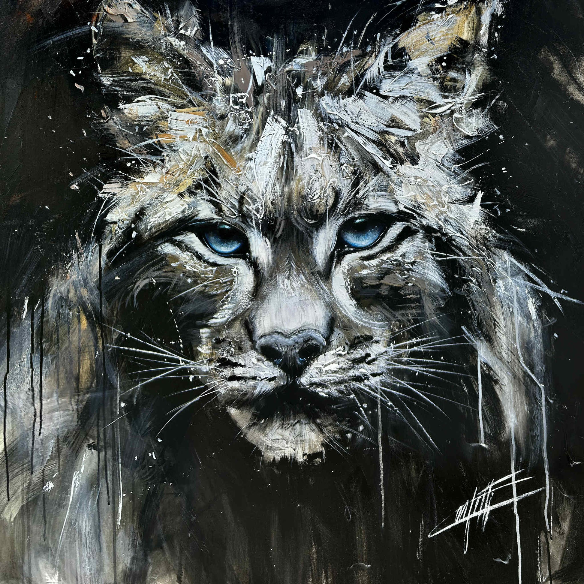 The Frosty Boreal Lynx Prince, modern art print by Confetti artist, textured, black and white, abstract, cat